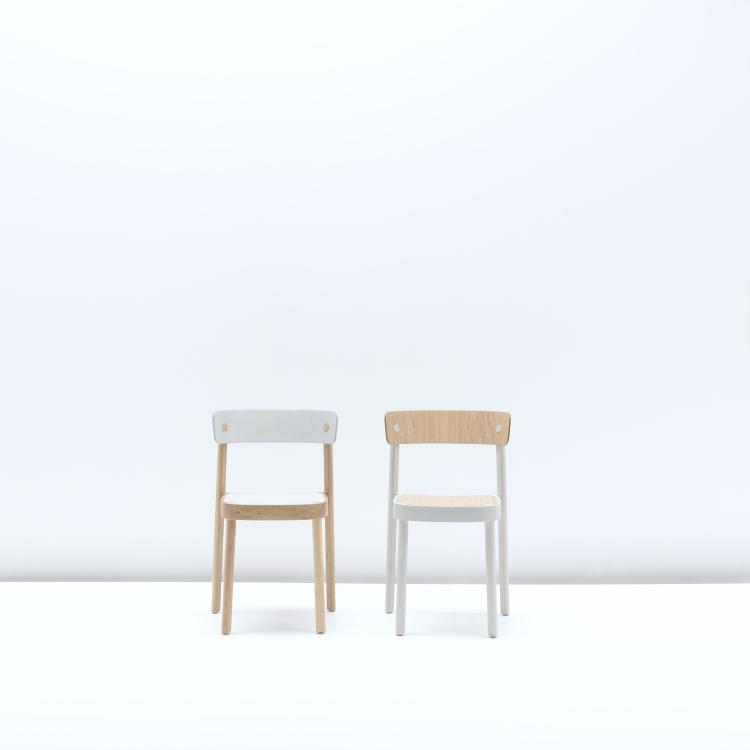 The chair is made of high-quality solid wood, while the backrest is crafted from layers of molded cellulose. Distinctive, circular connection points between the backrest and frame, along with the recessed, contrasting-colored seat, give the chair its unique character.